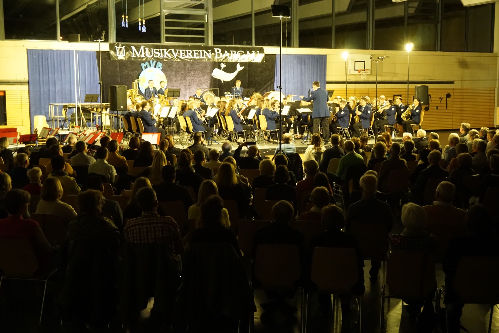Unter derselben musikalischen Leitung übernahm das aktive Blasorchester den abschließenden Teil des Konzerts. Mit dem Hauptact „Of Sailors and Whales“ von W. Francis McBeth trug das Orchester das in fünf Sätzen gegliederte Werk in der Höchststufe vor. Die fünf Sätze beruhen auf fünf Szenen aus Herman Melville’s berühmtem Roman „Moby Dick“ und versetzten die Zuhörer in die Welt der Seefahrer und des Walfangs. Die weiteren Stücke des aktiven Blasorchesters aus der italienischen Pop-Szene verleiteten das Publikum bei einigen Klassikern mit zu singen und zu klatschen. Besonderen Eindruck hinterließ die herausragende Einlage des Schlagwerks bei der Abenteuerreise nach Afrika im Stück „Jungle Fantasy“. Hier wurden mit sämtlichen Mitteln Tierlaute und Geräusche nachgeahmt, sodass der Zuhörer sich wie im Dschungel gefühlt hat. Diese positive Gesamtstimmung und das stimmig schöne und abwechslungsreiche Programm veranlasste viele der Konzertbesucher im Anschluss an das Konzert noch zum gemütlichen Beisammensein und Ausklang des Abends.